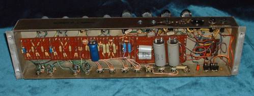 Early model with the caps under the Board ,Original transformers and choke, note the extra speaker jack to the left, this amp also has a jack hole in-between the 8 inputs where a the pot was removed, its had plenty of service work & some minor cosmetic changes(feet,light,fuse holder)over the years GREAT TONE!