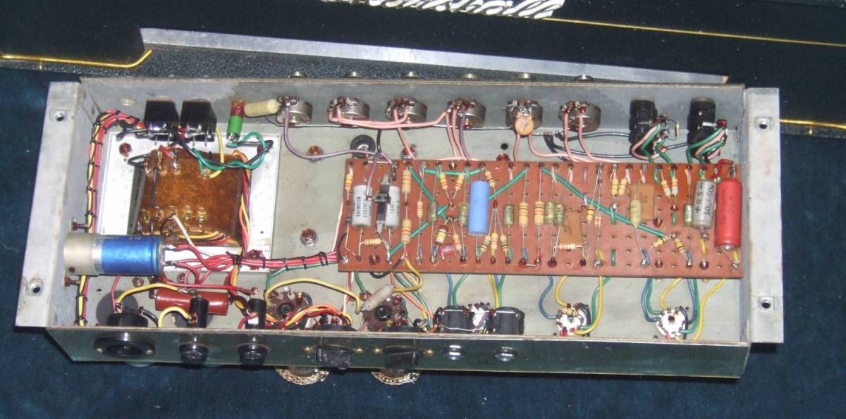 Its early circuit as seen above features many RS parts,it also has Green Black Tolex and Alley blocks at the end of the chassis just like the 66 JTM45's.