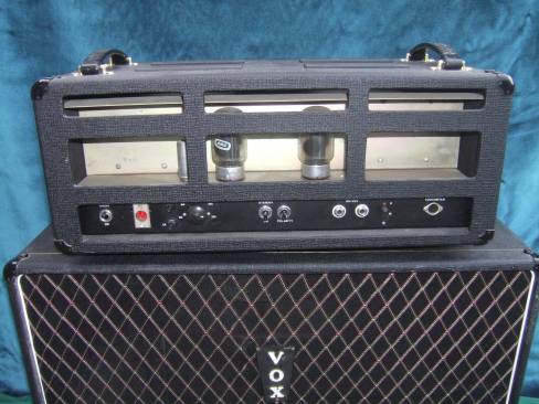 ABOVE: VOX 7120 Now Sold. The unique feature about the amplifier is that the design is extremely complex for a 1966 guitar amplifier. Specifically, the power unit of the amplifier utilizes four KT-88 tubes with two driver tubes. One EL84 and one ECL86. According to the VOX catalogue the minimum power output the amplifier can produce is 120 watts RMS. Given this set of power tubes approximately 180 watts output is well within the capacity of this amplifier. The amplifier has an ultra-linear output stage powered by albion transformers. This set up is designed to accurately reproduce and amplify the signal submitted to it by the pre-amp section of the amplifier by means of negative feed back loops. Therefore, all musical notes are faithfully reproduced at the same volume level and same tonal quality in much the same way that a very expensive high fidelity system would reproduce the signal from a record. Therefore, the signal reproduced is extremely clean and powerful under this design. In addition, each KT-88 tube has its own separate bias control which allows for a fine tuning of bias for each tube to allow for a maximum output with a minimum of distortion. The pre-amp section of the amplifier is based upon signals generated by solid-state transistors. The type of transistors used at the time were transitional. Prior transistors used in JMI amplifiers were made of germanium. For example, Germanium transistors were used in the VOX T-60 base model. Later, FET transistors were used in the American VOX solid state models such as the Beatle manufactured by Thomas Organ. The transistors used in the 7120 model were silicon transistors designated as BC-107 and BC-109 transistors. The vibrato for the amplifier has an AC-128 transistor. The reverb for the amplifier has an AC-127 transistor. The reverb is powered by a single spring suspended unit. *************************************** VOX 760 The UL760 is almost identical in appearance and electronic circuitry to its bigger brother the UL7120 . It was produced in greater numbers than the UL7120, but is nonetheless still a rare find today. These amplifiers, when on the market, can fetch $TOP$ for a head alone. The UL760 is a studio friendly amplifier when compared to the more powerful UL7120. The pre-amplifier section in all "7" series amplifiers are exactly the same except for the UL705 and the UL710 which are all valve models.