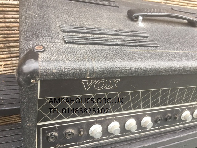 The amps had a double row of vents for extra ventilation. The Beatles 7120 amps had one-pin corners Production 7120 amps had two-pin corners.The logos on the Beatles 7120 speaker cabinets had gold letters. The logos on production cabinets had white letters, The Beatles head cabinets had one strap handle, centered on the top of the cabinet Whilst Production heads had two strap handles, located on the top left and top right of the cabinet,This was due to the extra row of vents which did not allow enough room for two handles. The backs on the Beatles 7120 heads were removable, fastened with four screws The backs on most production models were not removable.The backs on the Beatles 7120 heads had only horizontal webs. The backs on production models had horizontal and vertical webs.The Beatles UL head cabinets were somewhat smaller than the production model, 22 1/2 X 11 1/2 X 8 1/2 inches similar in size to the 730 head cabinet. VOX UL 710 715 730 760 4120 7120 430 -4120 etc come and go quickly as they are always realistically priced to sell. Please send your want list to ampaholics@aol.com