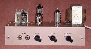 Valve complement: is: EZ80 rectifier, ECC83 tremolo oscillator/buffer, EF86 pre-amp and EL84 output. Valves are secured in McMurdo sockets by simple wire retainers - no screening cans. Sockets are marked 80, 86 etc. in black paint. | |